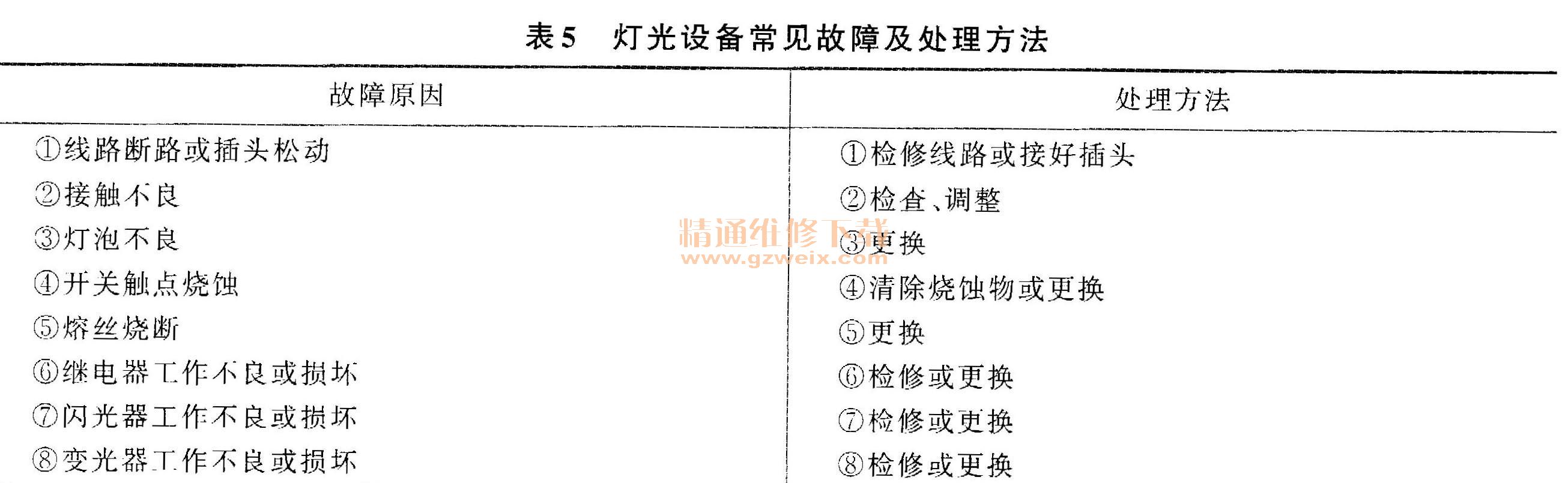 燈光設備常見故障及處理方法見表5。