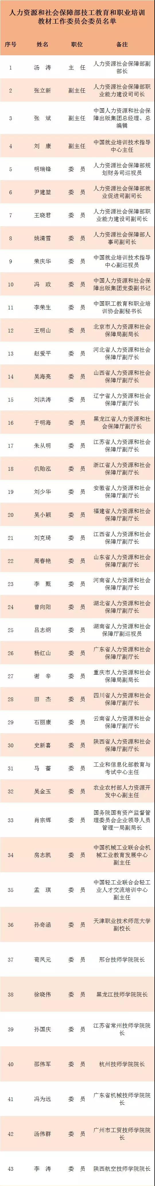 同時,對委員人選進行調整,在有關單位推薦人選的基礎上,確定了技工教育和職業培訓教材工作委員會委員名單(見附件),現予以公布。地方委員實行席位制,由有關省、自治區、直轄市人力資源社會保障廳(局)分管職業能力建設工作的廳(局)長擔任所在地方委員;當分管人員發生變動時,由接任人員遞補擔任地方委員。