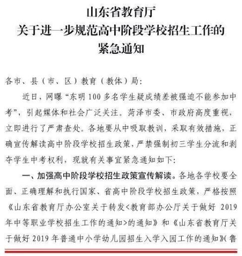 山東技校網 >> 菁菁校園 >> 山東省教育廳發文:規范高中招生!嚴禁強制分流初三學生!