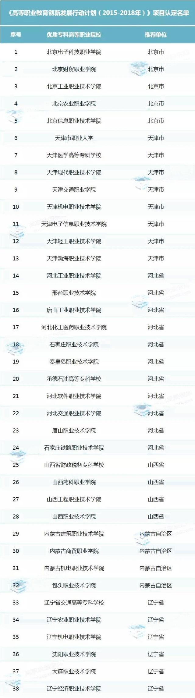 高考于前日已經在全國全部結束,接下來考生們要做的就是估分、了解各個大學及專業情況了。而近日,根據教育部辦公廳關于開展《高等職業教育創新發展行動計劃(2015-2018年)》項目認定的通知的有關要求,將優質高等專科高等職業院校的名單進行了公示,公示的時間是2019年6月10日起到6月14日止。下面是詳細名單,大家一起來看看: