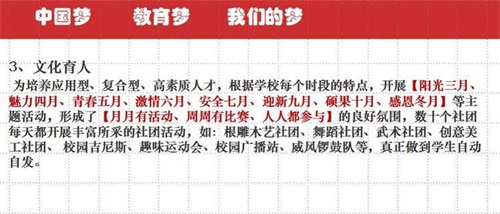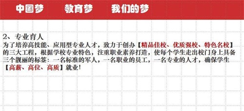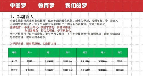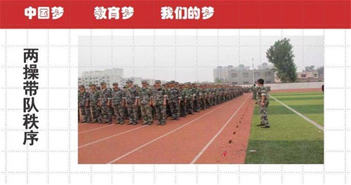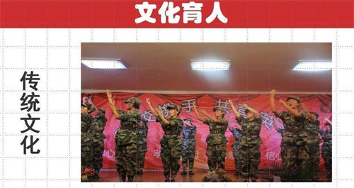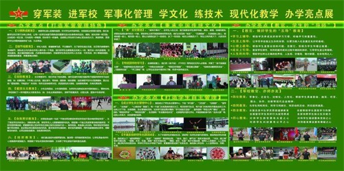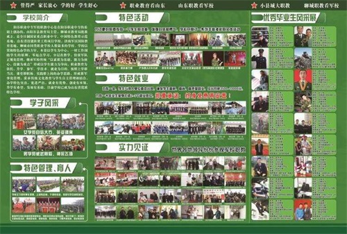陽谷軍校職教中心以貫徹特色辦學方針,本著以學生為中心,一切工作圍繞學生的原則,零起點學習,分層次教學,效仿軍隊正規化管理,繼承軍隊優良傳統“以素質為基礎,能力為核心,技能為重點”形成以學生能力為導向,職業教育為依托,升學、參軍、學技術、就業為目的。按照上學即當兵、課堂即職場、實踐即上崗的辦學思路,形成準軍事化管理,秉承傳統文化教育與學生自主管理相結合,辦學特色突出,寬進嚴出,就業有優勢,創業有本領,升學有希望,發展有基礎,目前學校已成為山東省優質特色學校。