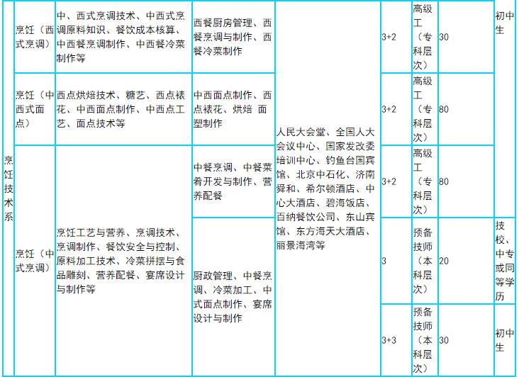 學院烹飪技術系開設“西式烹調、中西式面點、中式烹調”等專業。與山東旅游職業學院聯合開設“中餐烹飪”三二連讀高職專業(招生計劃50人)。烹飪是省級重點專業和品牌專業。依托烹飪技術系教育資源,成立了煙臺市魯菜研究所、山東省技師工作站等產學研一體化平臺,被確定為中國魯菜學府、中國魯菜之都高技能人才培訓基地、佳中國魯菜學府,被評為山東省烹飪餐飲行業團體膳食優秀單位、全省餐飲行業營養健康美食示范單位,是國內傳承和弘揚魯菜文化、培育烹飪技能人才的重要基地。