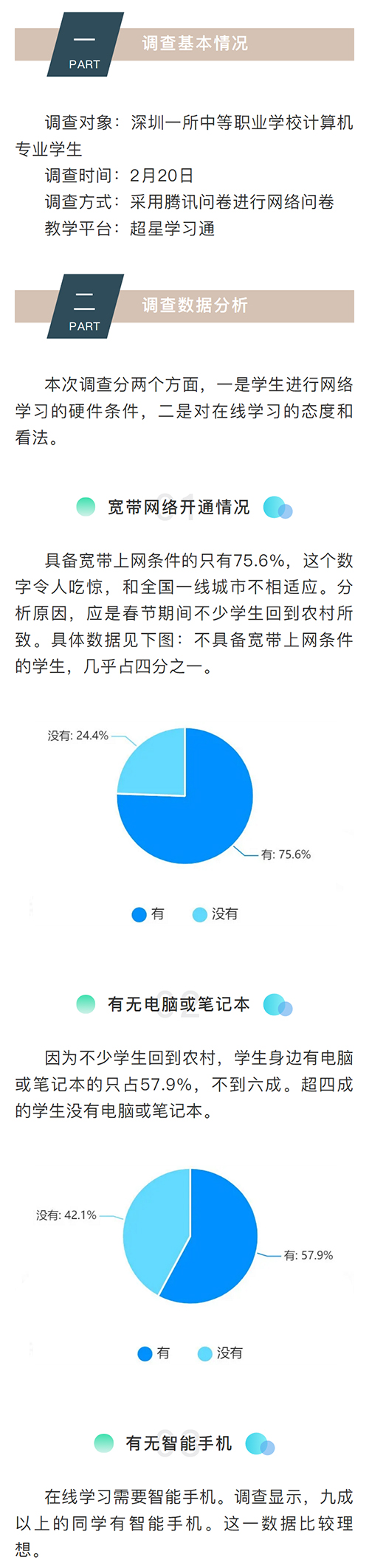兩周多了,在線教育進行得如何?尤其是職業教育的在線教育進行得怎樣?學生學習狀態怎樣?學習效果如何?為此,筆者在本校計算機專業進行了一次調查,取得了一些數據。分析這些數據有助于我們了解在線教育的情況,把在線教育工作做得更好。