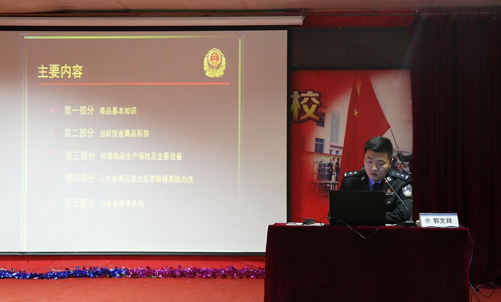 為讓廣大在校學(xué)生牢固樹立“珍愛生命,遠(yuǎn)離毒品”意識(shí),深刻了解、認(rèn)識(shí)新型毒品,防范各類毒品的危害,提升學(xué)生甄別毒品的、拒絕誘惑的能力,增強(qiáng)師生參與禁毒斗爭的意識(shí),防范毒品進(jìn)入校園。12月24日,山東東營金盾司法學(xué)校邀請(qǐng)東營市公安局禁毒支隊(duì)干警郭文祥同志為全校師生開展了一次意義非凡的禁毒知識(shí)講座。學(xué)校校長楊萬里,書記宋國謙、常務(wù)副校長劉寶存以及張河政委出席本次講座,李長峰副校長主持講座。