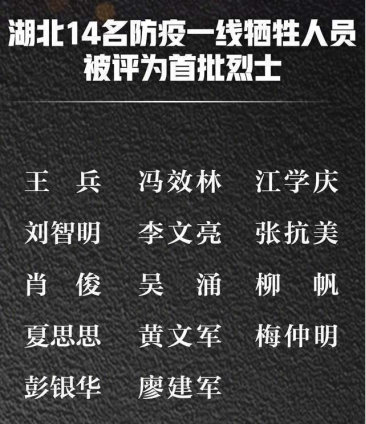前天,湖北省14名防疫一線犧牲人員被評為首批烈士。