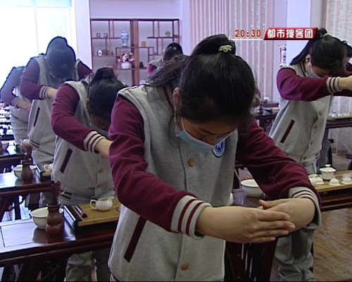 電視臺記者首先來到濟南應用技術職業中等專業學校的茶藝室,課堂上,師生問好改成了行作揖禮。不光是課上,下課之后同學、老師相遇,也是用作揖禮打招呼。