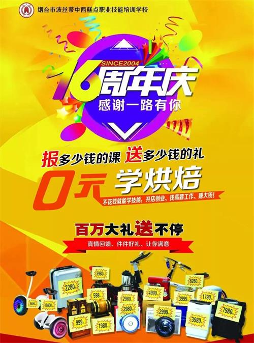 煙臺市波絲蒂中西糕點職業技能培訓學校創立于2004年,是中西糕點專業培訓機構,是煙臺市人力資源和社會保障局指定的正規技能培訓基地。西點課程設置全面:面包專科班、蛋糕?瓢唷⑿蓍e干點班、月餅?瓢唷⑴_專科班、裱花?瓢、法式甜品?瓢唷㈨n式裱花班、休閑飲品咖啡班、健康日式面包提升班、私房創業綜合班、業余西點流行班等等。