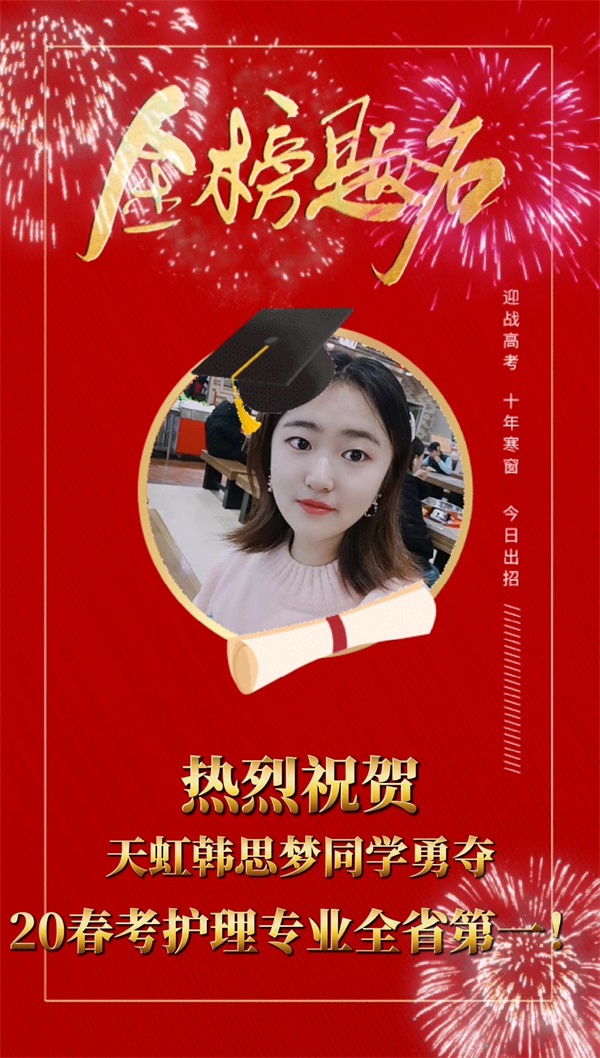 護(hù)理專業(yè):韓思夢同學(xué)勇奪全省第一,該專業(yè)包攬全省第一、二、三、五名,42人進(jìn)入全省前100名 ,71人進(jìn)入全省前200名!本科上線率高達(dá)81.8%!