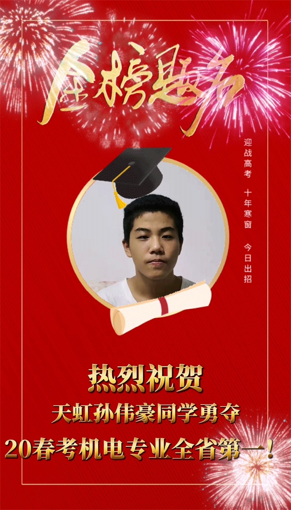 機(jī)電專業(yè):孫偉豪同學(xué)勇奪全省第一,該專業(yè)包攬全省前3名,7人進(jìn)入全省前10名,40人進(jìn)入全省前100名,87人進(jìn)入全省前200名!本科上線率高達(dá)93.2%!