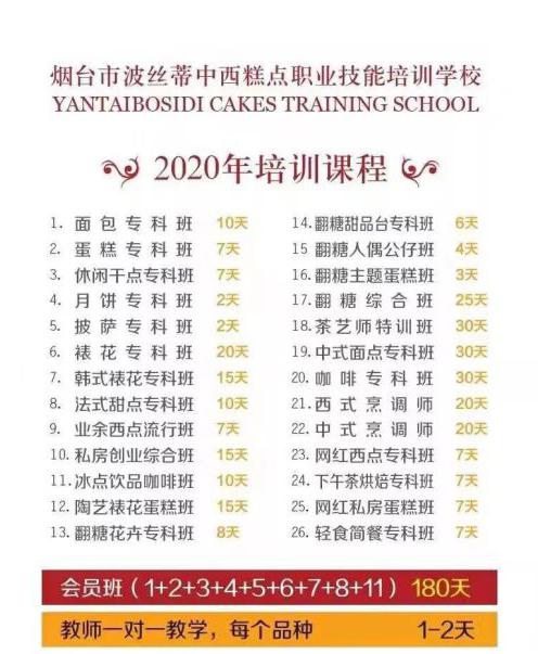 煙臺市波絲蒂中西糕點職業技能培訓學校創立于2004年,是中西糕點專業培訓機構,是煙臺市人力資源和社會保障局指定的正規技能培訓基地。西點課程設置全面:面包專科班、蛋糕專科班、休閑干點班、月餅專科班、披薩專科班、裱花專科班、法式甜品專科班、韓式裱花班、休閑飲品咖啡班、健康日式面包提升班、私房創業綜合班、業余西點流行班等等。