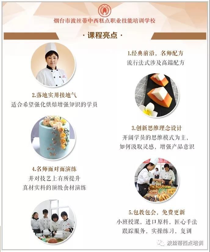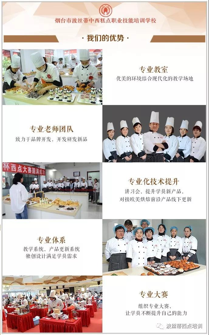 煙臺(tái)市波絲蒂中西糕點(diǎn)職業(yè)技能培訓(xùn)學(xué)校創(chuàng)立于2004年,是中西糕點(diǎn)專(zhuān)業(yè)培訓(xùn)機(jī)構(gòu),是煙臺(tái)市人力資源和社會(huì)保障局指定的正規(guī)技能培訓(xùn)基地;大學(xué)生及再就業(yè)人員職業(yè)技能培訓(xùn)基地;煙臺(tái)市金藍(lán)領(lǐng)高技能人才培訓(xùn)基地。西點(diǎn)課程設(shè)置全面:面包專(zhuān)科班、蛋糕專(zhuān)科班、休閑干點(diǎn)班、月餅專(zhuān)科班、披薩專(zhuān)科班、裱花專(zhuān)科班、法式甜品專(zhuān)科班、韓式裱花班、休閑飲品咖啡班、健康日式面包提升班、私房創(chuàng)業(yè)綜合班、業(yè)余西點(diǎn)流行班等等。