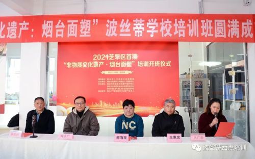 2021年12月13日上午,2021芝罘區首屆“非物質文化遺產·煙臺面塑”培訓班在煙臺波絲蒂中西糕點職業技能培訓學校順利開班。本次培訓旨在更好地傳承發揚“煙臺面塑”這項非遺文化,推進國家非物質文化遺產保護工作,培養一批德才兼備的合格傳承人,充分發揮膠東文化資源豐富和傳統文化底蘊深厚的優勢,培養和帶動非遺專業人才更好地提升技能、就業創業。 煙臺市芝罘區公共就業和人才服務中心培訓科邢海英科長(中)、煙臺面塑傳承人本次培訓老師陶永廣(左二),中飯協膠東促進委研究院秘書長王惠忠(右二),煙臺市波絲蒂中西糕點職業技能培訓學校校長陳紅林(左一)共同出席了開班儀式。