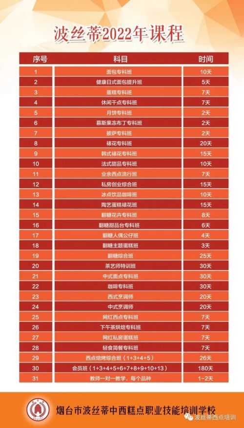 煙臺市波絲蒂中西糕點職業技能培訓學校創立于2004年,是中西糕點專業培訓機構,是煙臺市人力資源和社會保障局指定的正規技能培訓基地;大學生及再就業人員職業技能培訓基地;煙臺市金藍領高技能人才培訓基地。西點課程設置全面:面包專科班、蛋糕?瓢唷⑿蓍e干點班、月餅專科班、披薩?瓢唷Ⅰ鸦▽?瓢、法式甜品?瓢、韓式裱花班、休閑飲品咖啡班、健康日式面包提升班、私房創業綜合班、業余西點流行班等等。