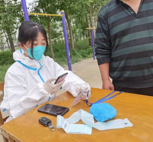 他們主要協助小區住戶進行每日例行核酸檢測。核實信息、發小粘貼、維持秩序等工作。身穿防護服連續工作數個小時是一項“艱巨的工作”,但是他們臉上依然掛著笑容,并且堅持下去,為社會和家鄉防疫獻出自己的一份力量。