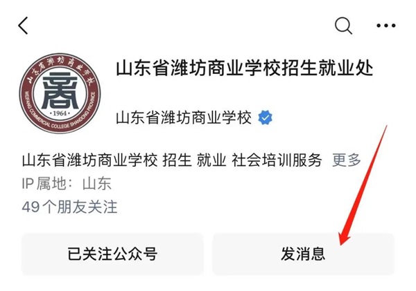 第1步:使用手機(jī)掃碼關(guān)注并打開“山東省濰坊商業(yè)學(xué)校招生就業(yè)處”微信公眾號。