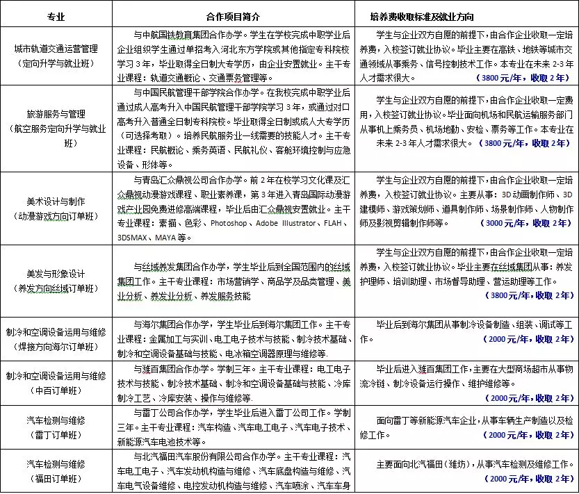 (特色、訂單班專業為校企合作專業,企業收取特色專業培養費)