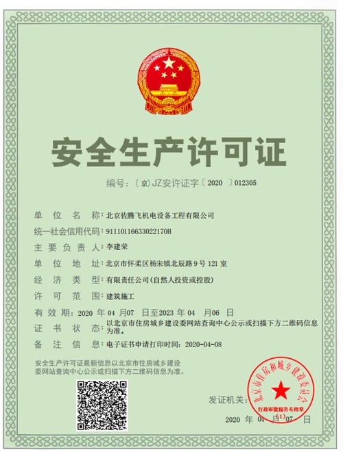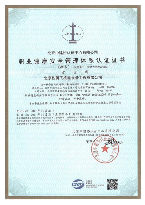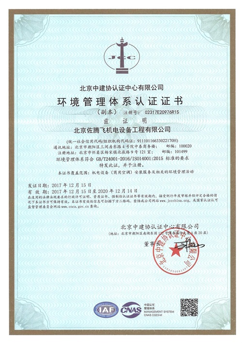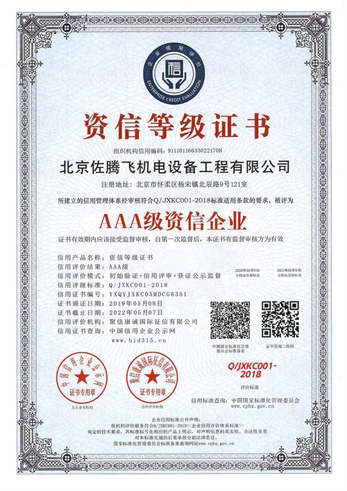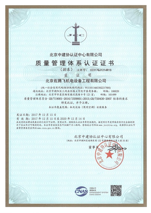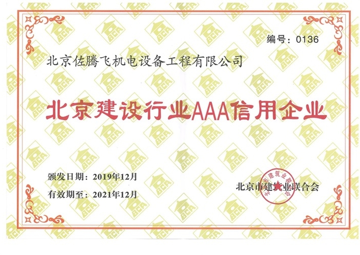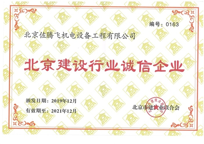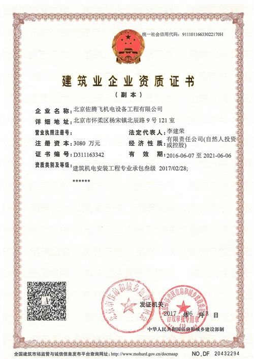 公司還擁有以下資質證書:機電安裝施工叁級資質、質量管理體系認證(ISO9001)、環境管理體系認證(ISO14001)、北京市建設行業AAA誠信企業認證、北京市國家稅務局頒發納稅A級企業。