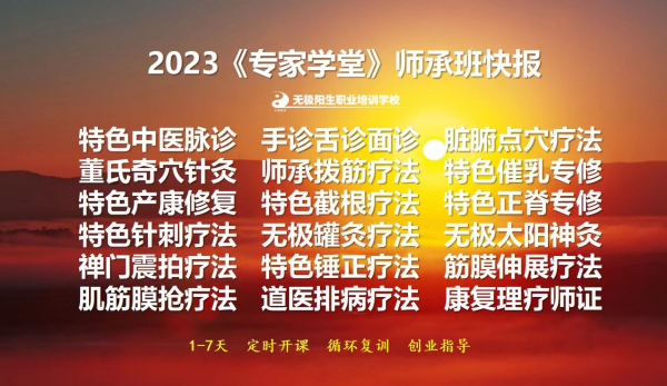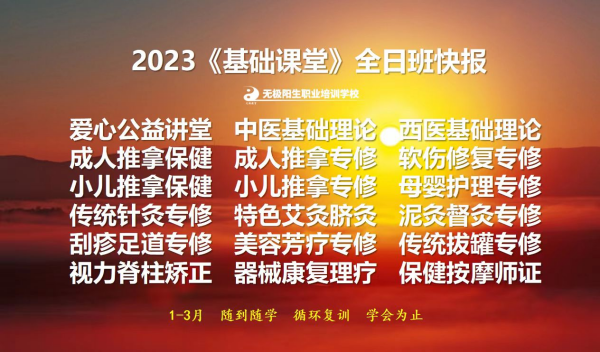 愛心公益課堂、中醫基礎理論、西醫基礎理論、成人推拿保健、成人推拿專修、軟傷修復專修、小兒推拿保健、小兒推拿專修、母嬰護理專修、傳統針灸專修、特色艾灸臍灸、泥灸督灸專修、刮疹足道專修、美容芳療專修、傳統拔罐專修、視力脊柱矯正、器械康復理療、保健按摩師證