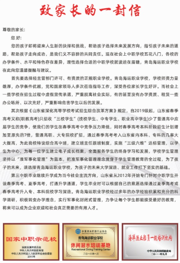 您的位置:山東技校網(wǎng) >> 青島技校網(wǎng) >> 青島海運(yùn)職業(yè)學(xué)校2024年招生簡章