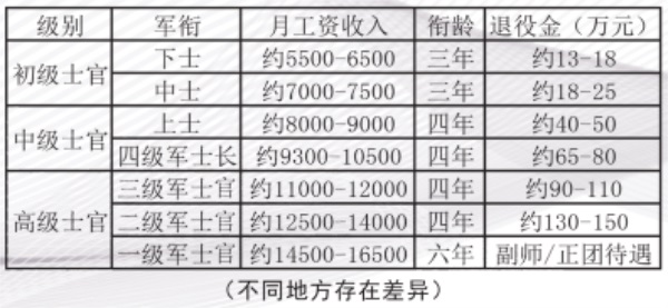 部隊(duì)包吃住,下士的月工資5500-6500元,中士的月工資7000元左右,每年13薪。比很多本科生的待遇都要好